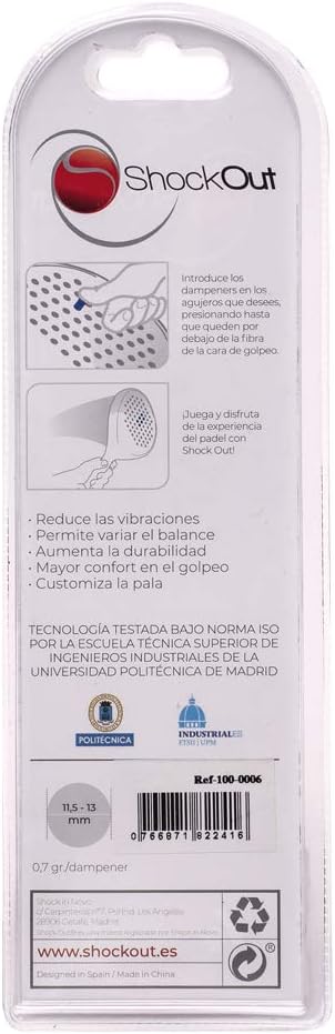 ShockOut réduit et absorbe les vibrations pendant le jeu. Recommandé pour les joueurs sujets aux blessures ou pour les joueurs qui souhaitent encore plus de confort en jouant au padel.